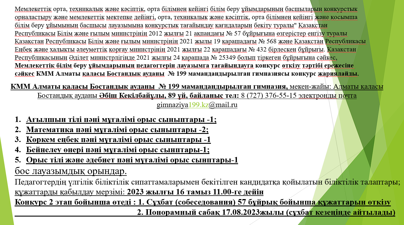 02 август 2023 0 1 2 3 4 5 "199 мамандандырылған гимназия" КММ Бос лауазымдарына орналасуға конкурс жариялау