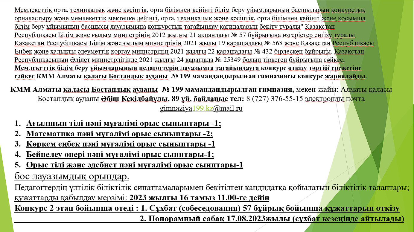 31 июль 2023 0 1 2 3 4 5 "199 мамандандырылған гимназия" КММ Бос лауазымдарына орналасуға конкурс жариялау