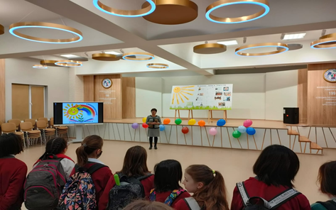 Также в главном фойе школы шел показ видео-роликов посвященный 81-летию автора программы нравственно духовного образования»Самопознание» С.А.Назарбаевой