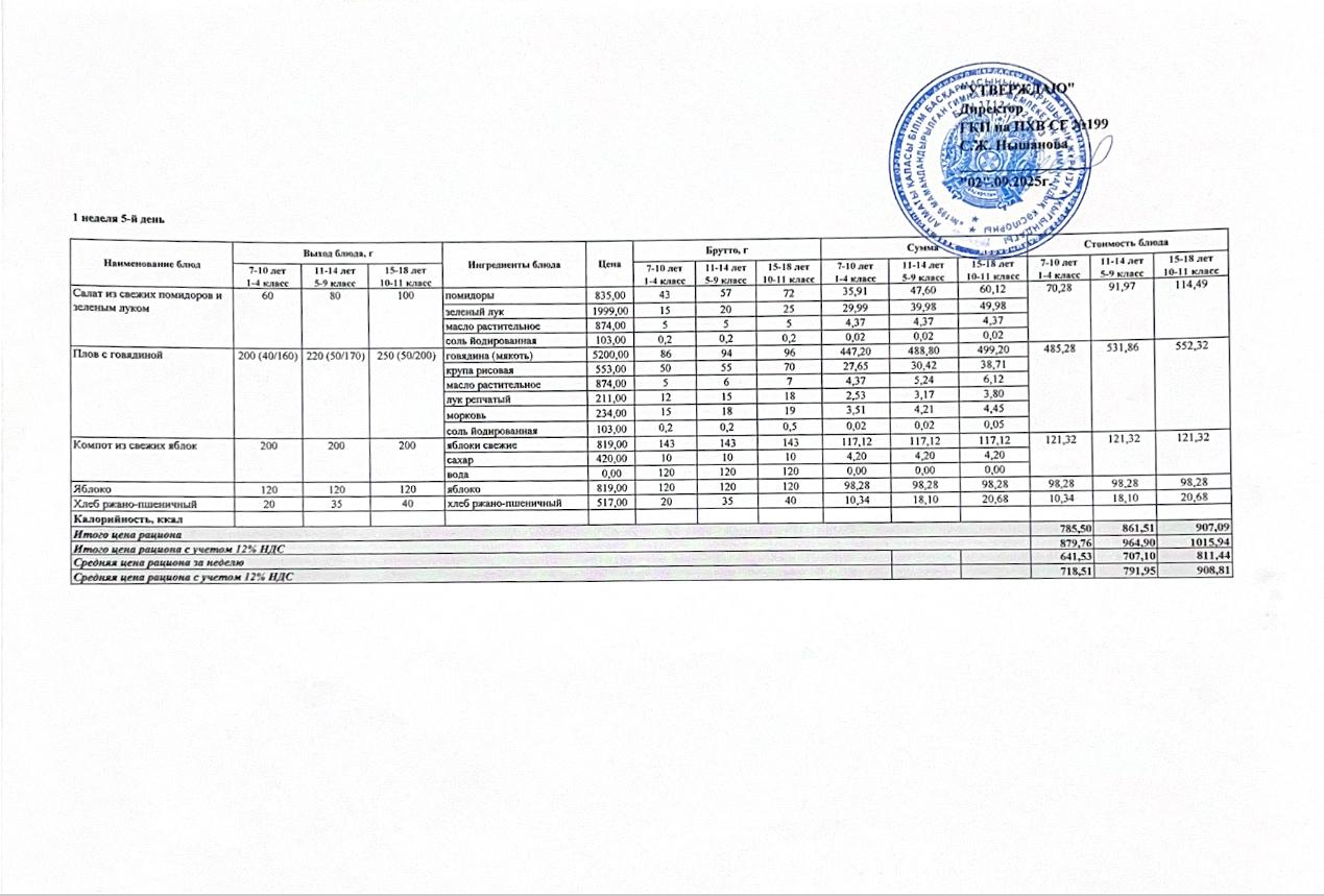 2025-2026 оқу жылына арналған тамақтану кестесі