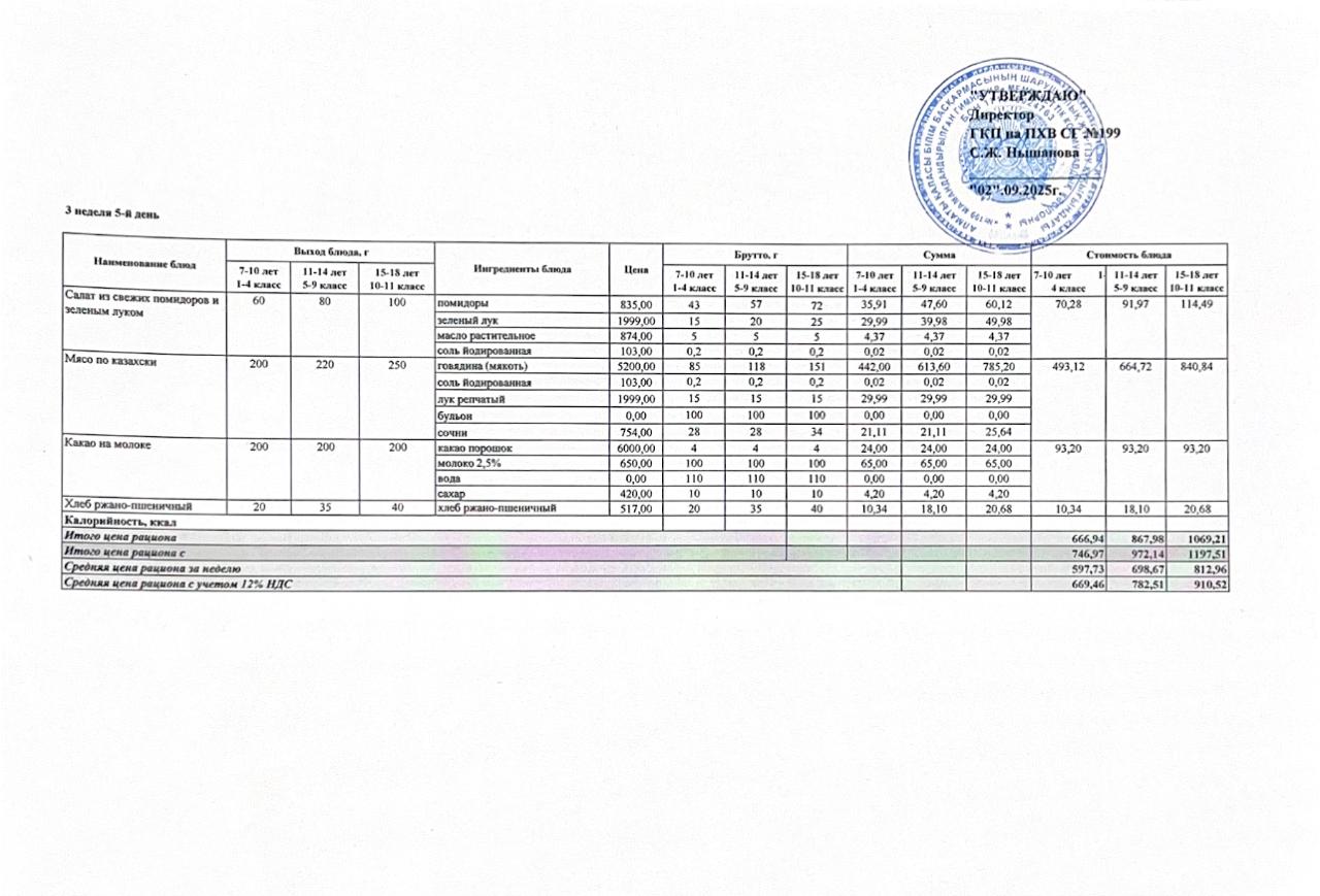 2025-2026 оқу жылына арналған тамақтану кестесі
