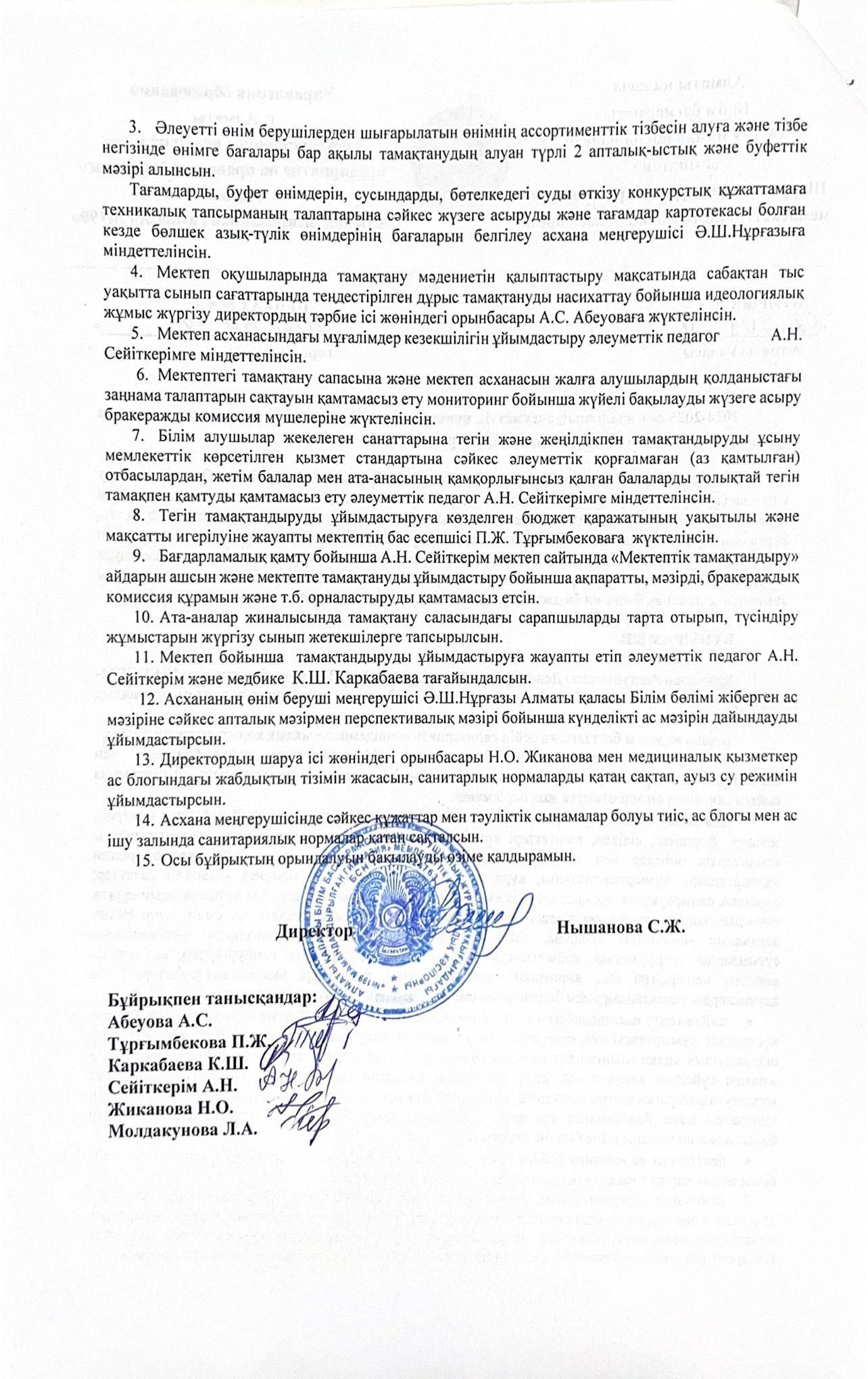 2024-2025 оқу жылына тегін тамақты ұйымдастыру туралы бұйрық